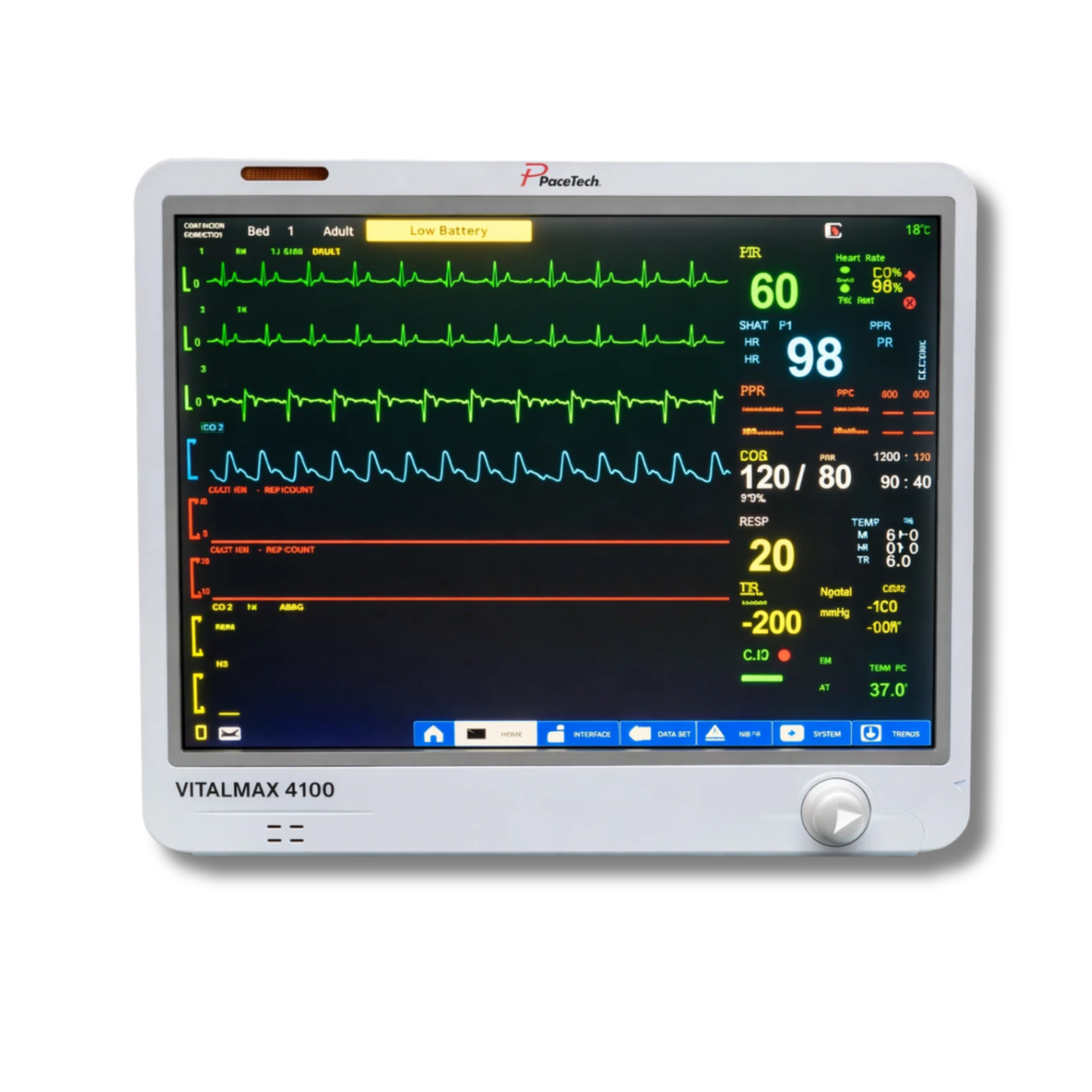 VitalMax 4100 with 15" touch screen and optional EtCO₂, Dual IBP, Anesthetic Monitoring, and 12-lead EKG.