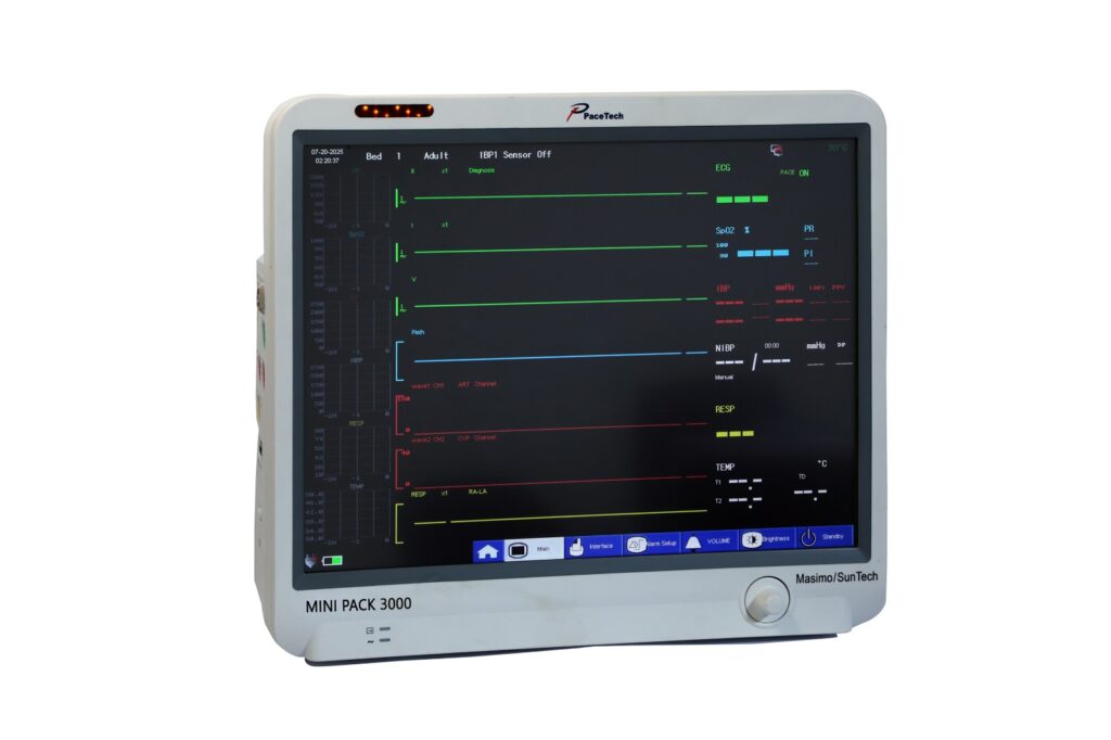 Compact Minipack 3000 Advanced Patient Care Monitor featuring an 8″ touch display and optional EtCO₂.